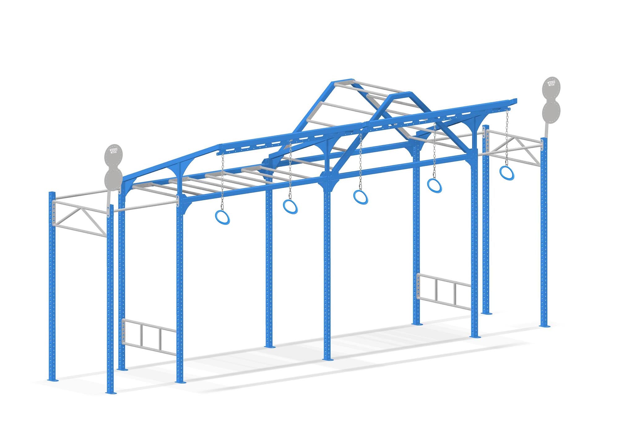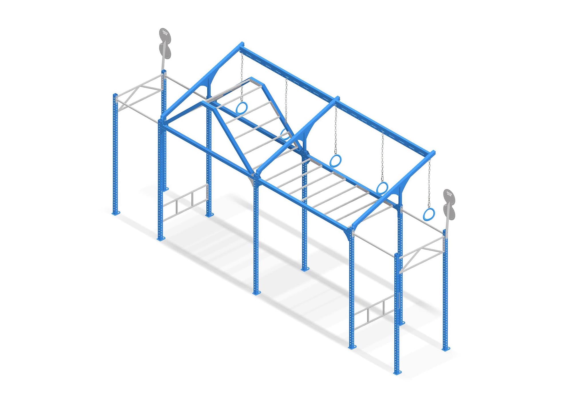The double rig monkey bars layout allows multiple athletes to train at once, combining grip, core, and upper-body strength work with scalable movement options for every fitness level. The incline monkey bars rig adds an extra challenge, promoting dynamic strength, coordination, and progression for users who want more.